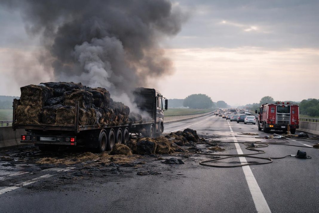Incendiu pe A10 la un camion cu baloți de lucernă: ce se întâmplă cu traficul